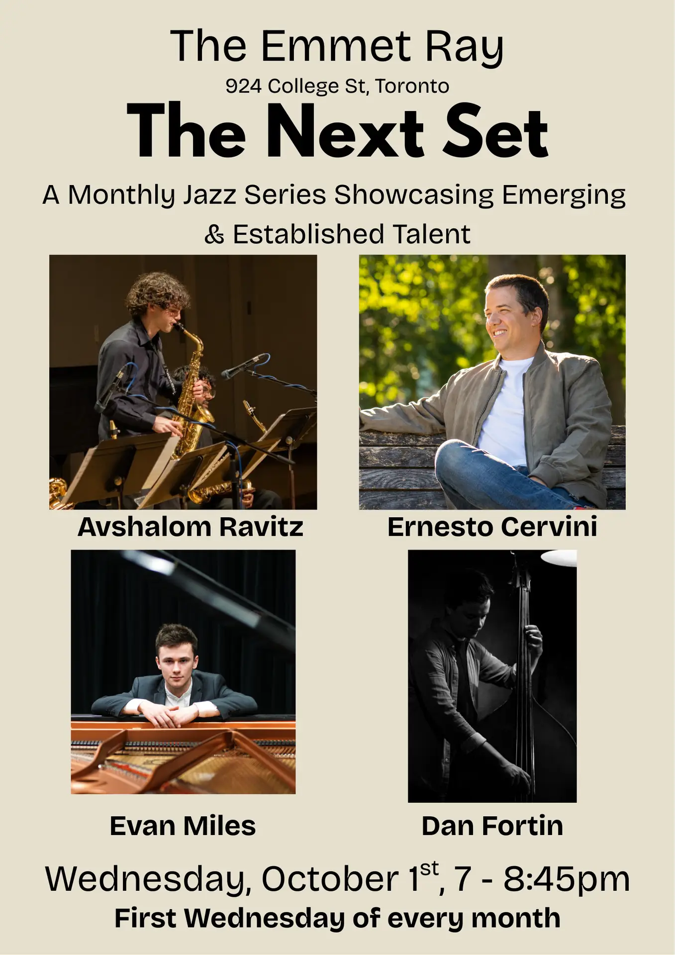The Next Set October 1, 2025 Toronto, ON The Emmet Ray Google Map A Monthly series celebrating collaboration and mentorship Avshalom Ravitz – Alto Saxophone Evan Miles – Piano Dan Fortin – Bass Ernesto Cervini – Drums